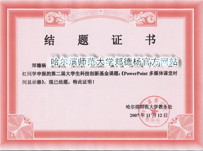 郑德杨 在哈尔滨师范大学申报的受第2届大学生科技创新基金资助的课题《PowerPoint多媒体课堂时间显示器》结题。2007年11月12日,哈尔滨师范大学向郑德杨颁发结题证书。